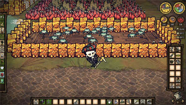 等到你能够存活过冬天,基本上在游戏里保命不成问题了,接下来的目标可以放在完善你的武器装备、制作出高营养的料理和补血道具,准备前往冒险模式破主线。个人推荐,前往冒险模式之前必备的两样装备,冬象背心和冰法杖。冰法杖虽然有耐久度,但是危急之际用来冻住敌人拉长距离非常好用,况且结冻的时间长,只要不去主 动攻击,冰法杖几乎是无敌的。其他两项可携空格则可根据冒险模式不同关卡的特性来考虑。