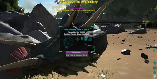 当我们将恐龙打晕之后,恐龙头上会出现一个带有紫色条的对话框,然后按e打开我们的背包,然后将食物投放到中间恐龙的背包当中,恐龙会吃掉这些食物,但是恐龙的负重是有上限的;