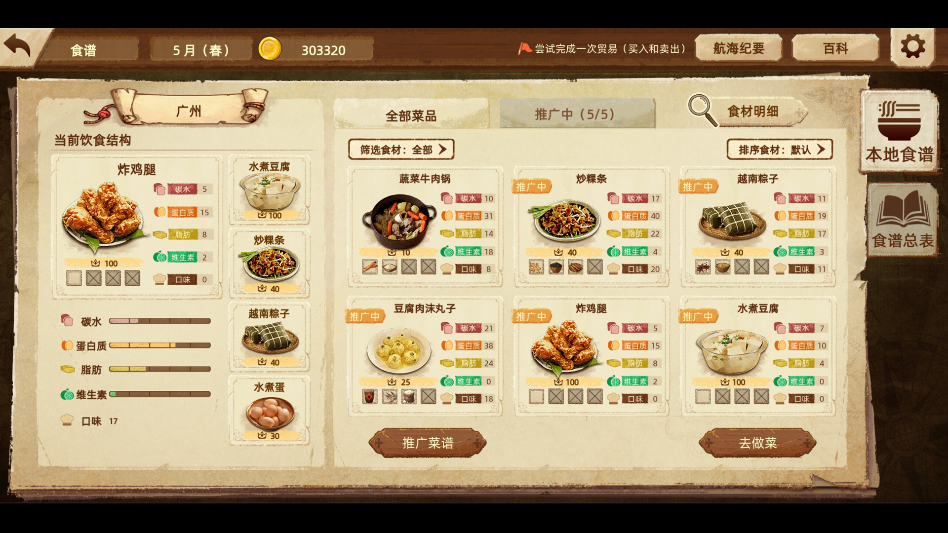 收集食材:通过贸易和航海收集丰富的原产食材。